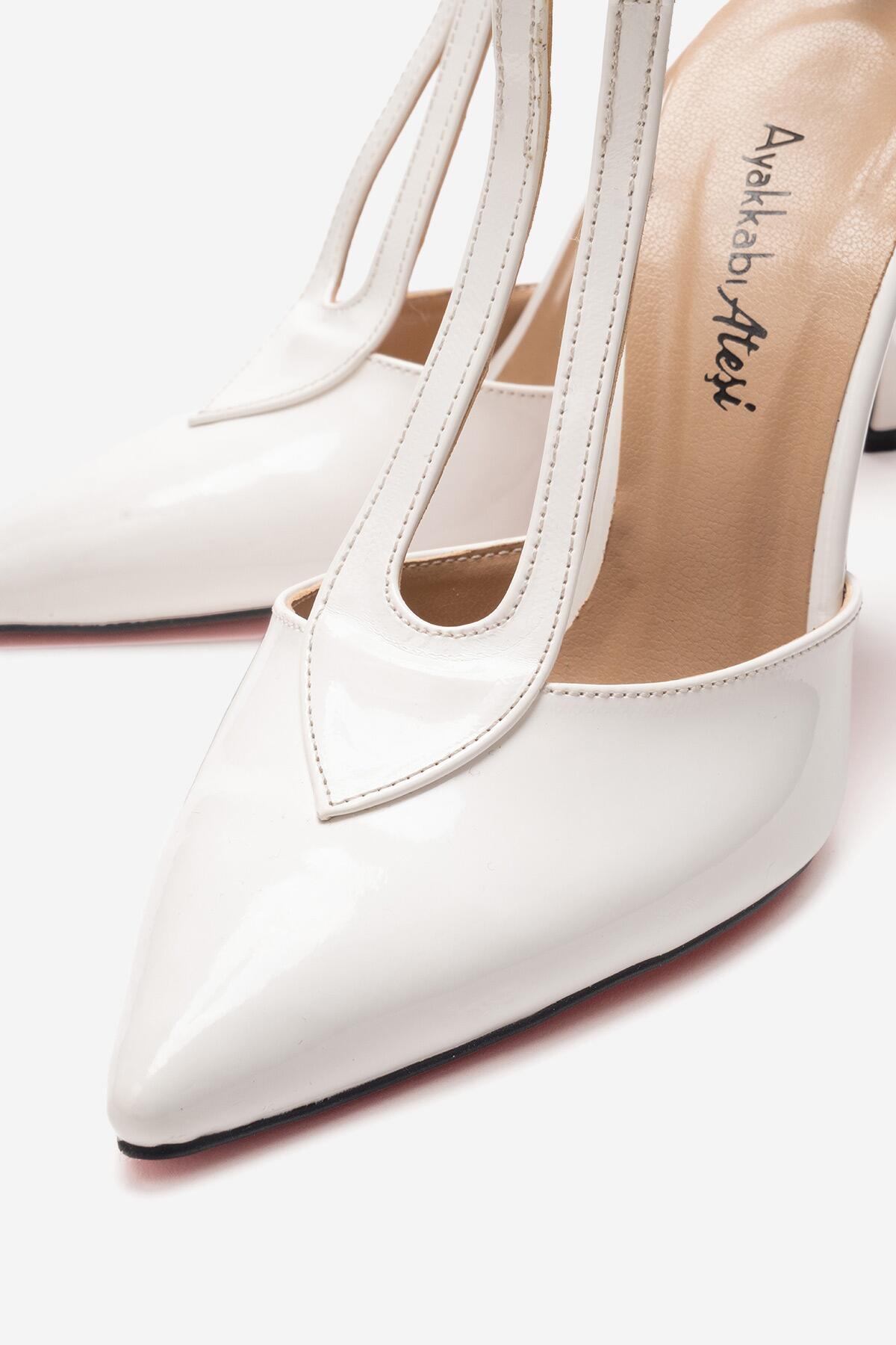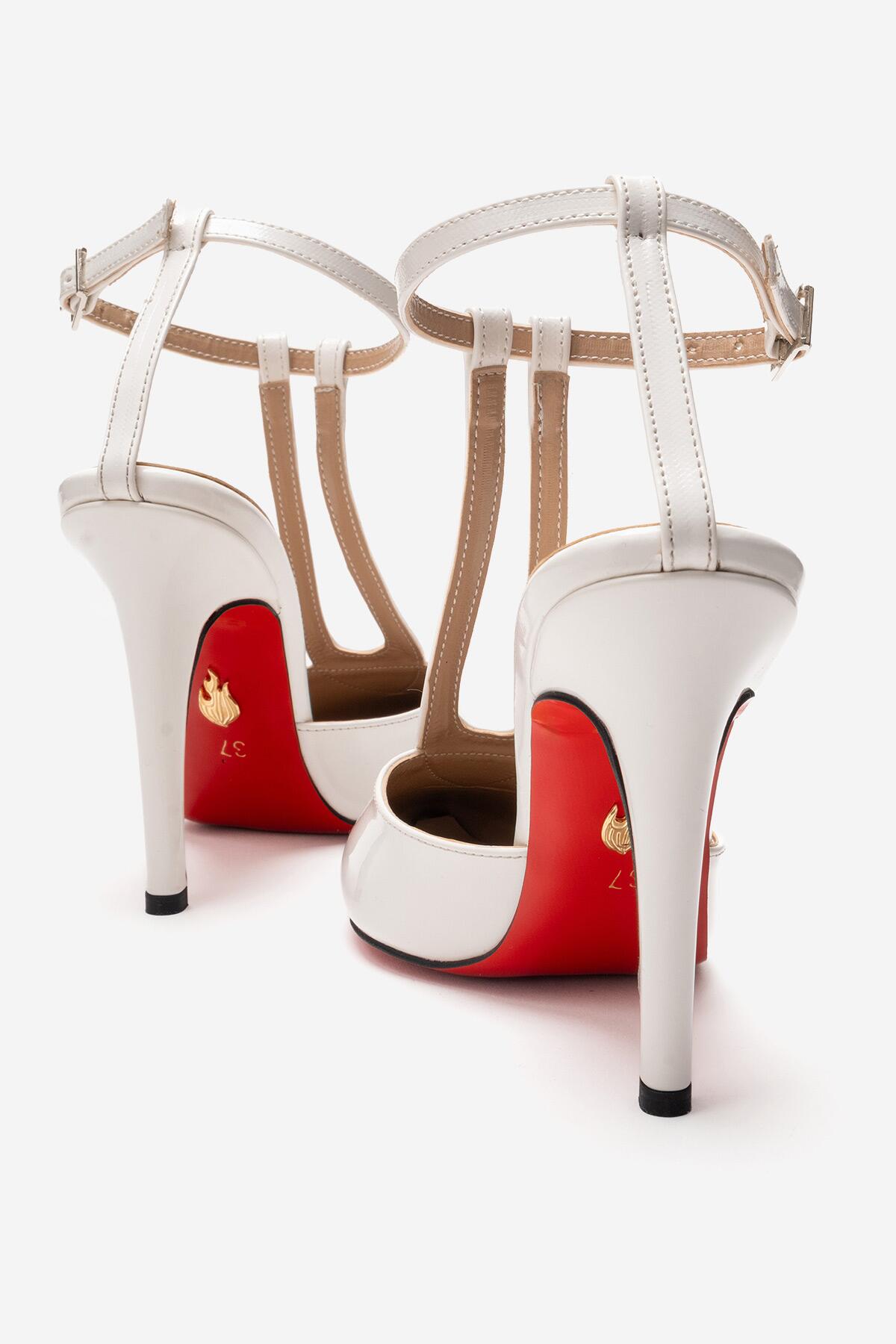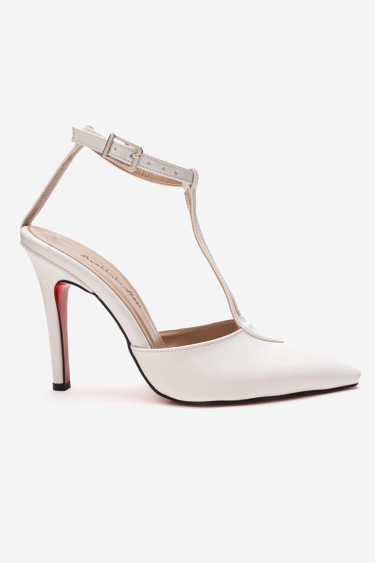 Kadın Sivri Burun T-bantlı Tasarım Topuklu Ayakkabı - Stiletto Stilo Beyaz Rugan