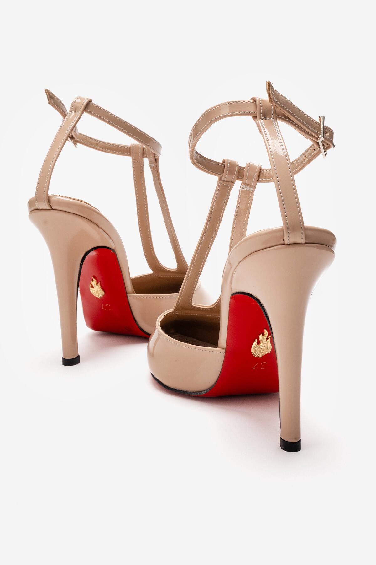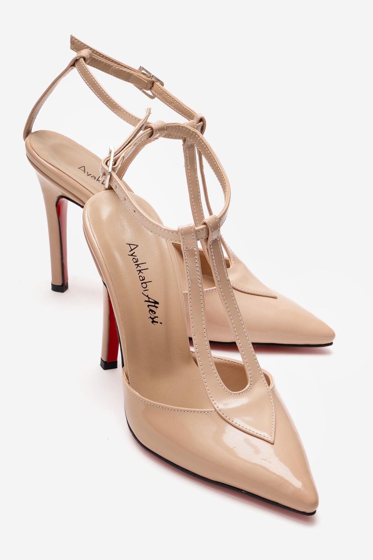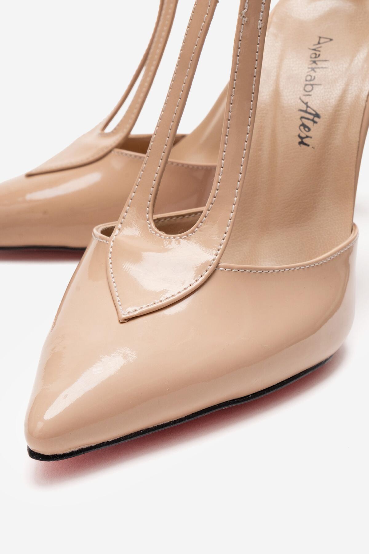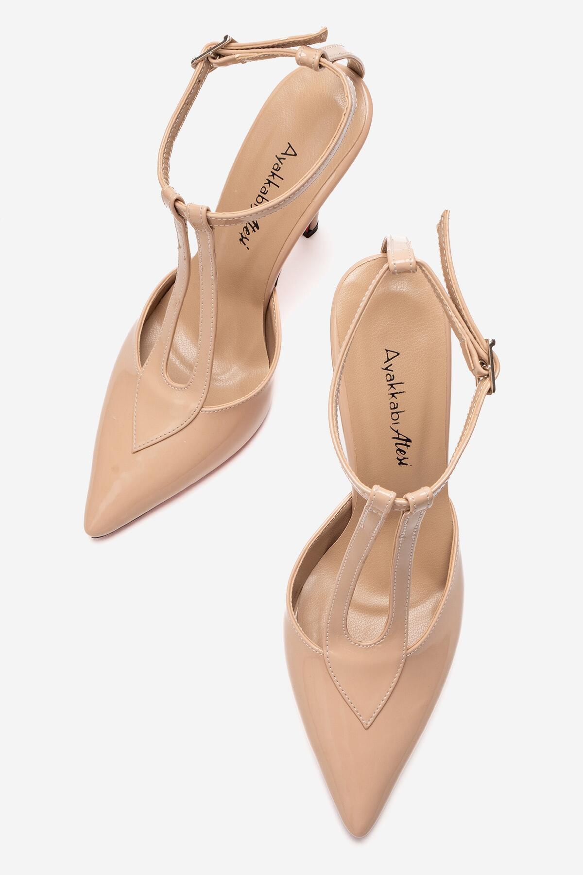 Kadın Sivri Burun T-bantlı Tasarım Topuklu Ayakkabı - Stiletto Stilo Nude Rugan