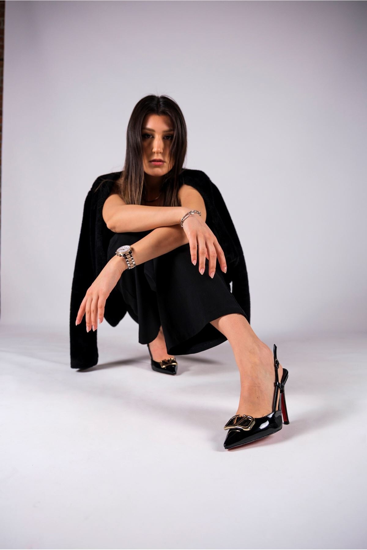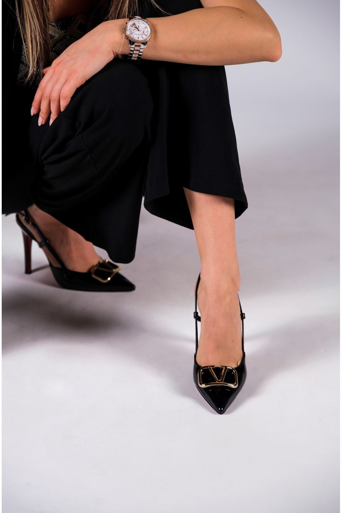 Kadın V Toka Detay İnce Topuklu Ayakkabı Kajino Siyah Rugan