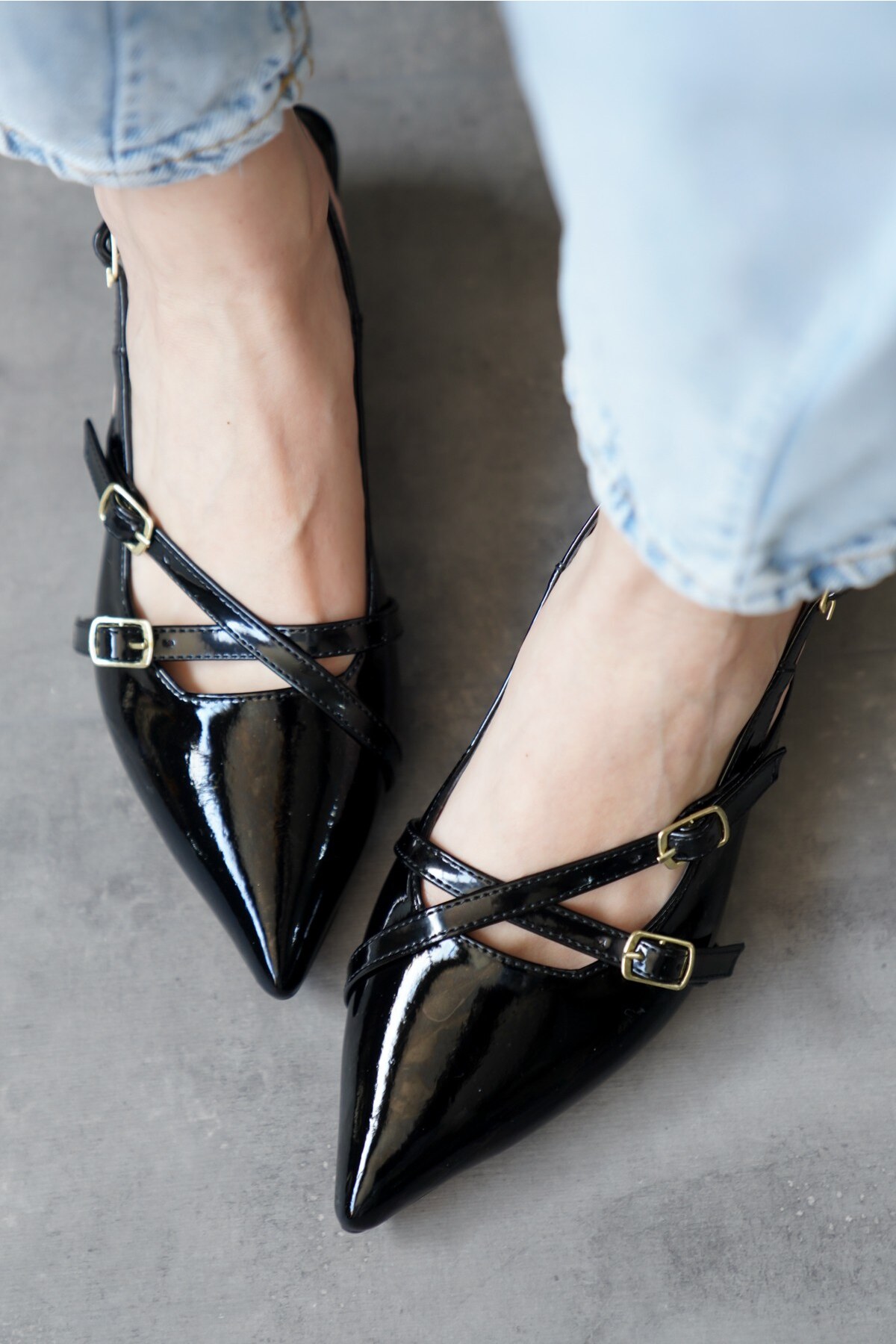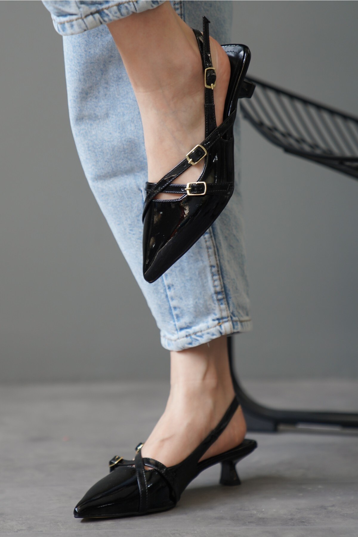 Siyah Rugan Üç Tokalı Kadın Kısa Topuklu Ayakkabı Seeroi Siyah