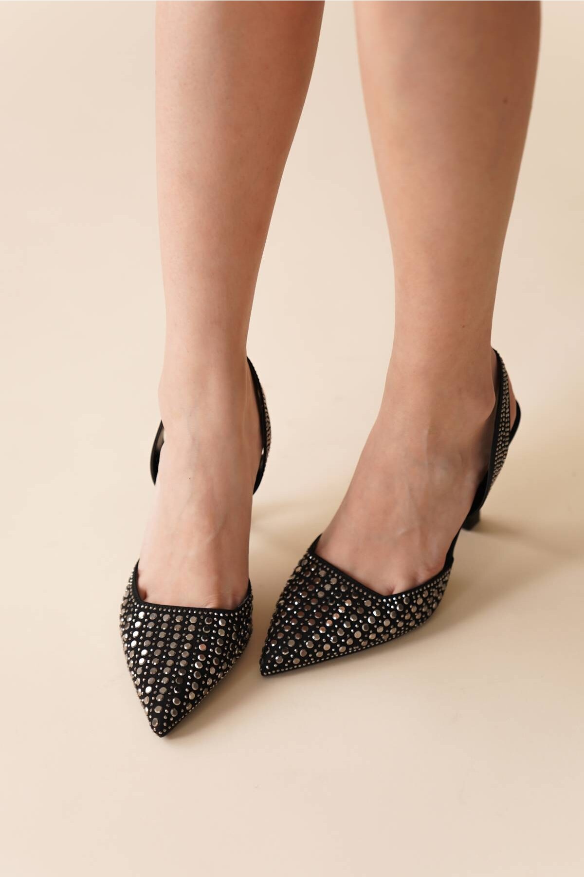 Siyah Saten Gold Taş Baskılı Kadın Tasarım Topuklu Ayakkabı Cirona Siyah Saten