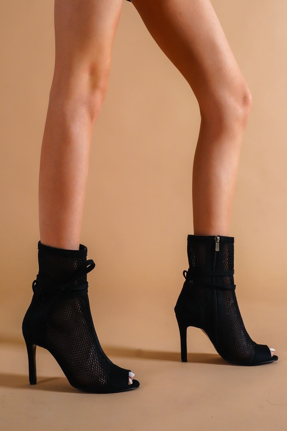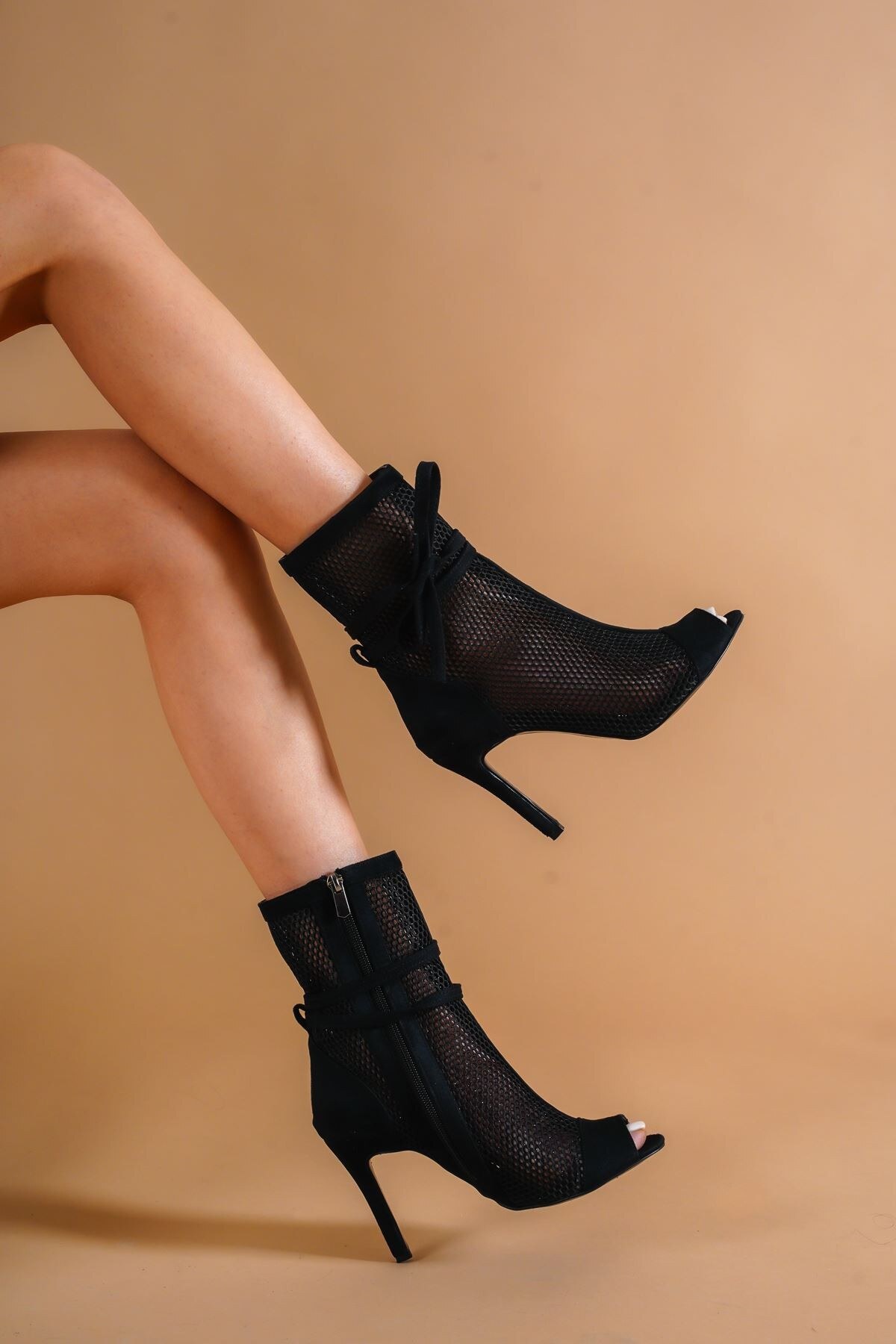 Kadın Fileli Tasarım İpli İnce Topuklu Ayakkabı Sugar Siyah