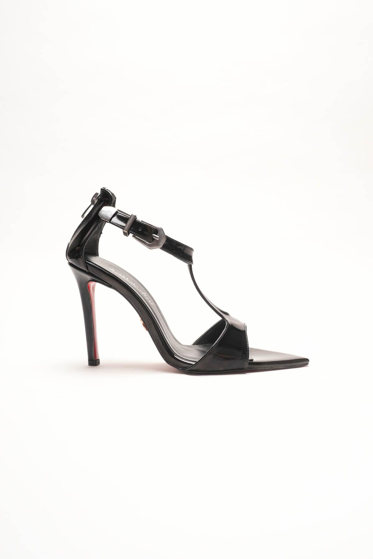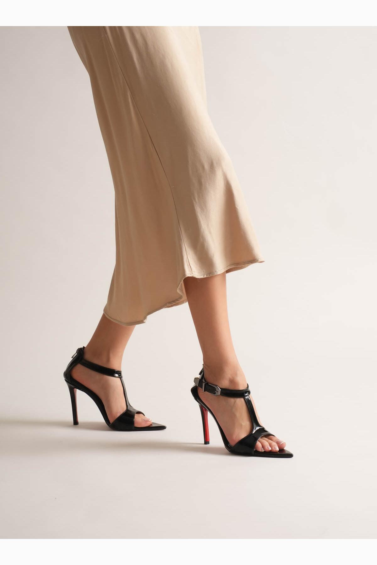 Siyah rugan T-bantlı stiletto, sivri burun tasarımı ve ince topuk yapısıyla sezonun en iddialı parçalarından biri. Kırmızı taban detayı ile lüks bir dokunuş katarını kombinleyin.